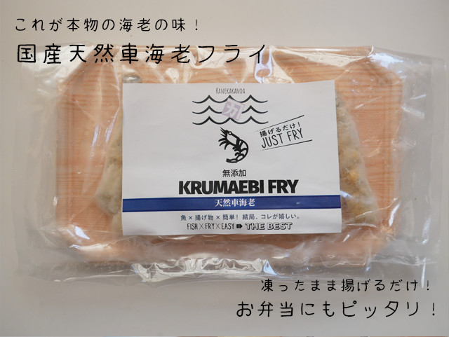 | 原材料 | 国産天然車海老フライ・無添加パン粉(北海道産小麦粉・沖縄県産海水塩・国内産生イースト)・卵・愛知県産小麦粉「きぬあかり」・天然塩「海の精」・有機ホワイトペッパー |