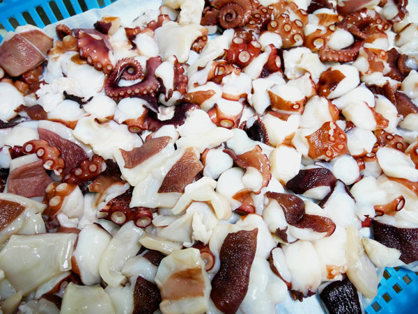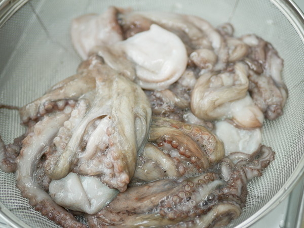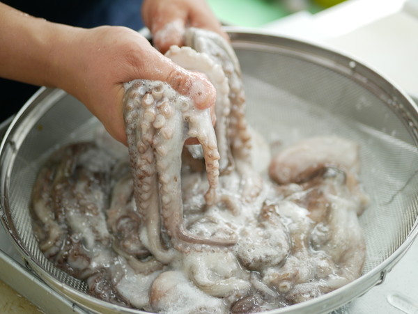 ①真空パックのまま流水解凍したタコを細かくカット