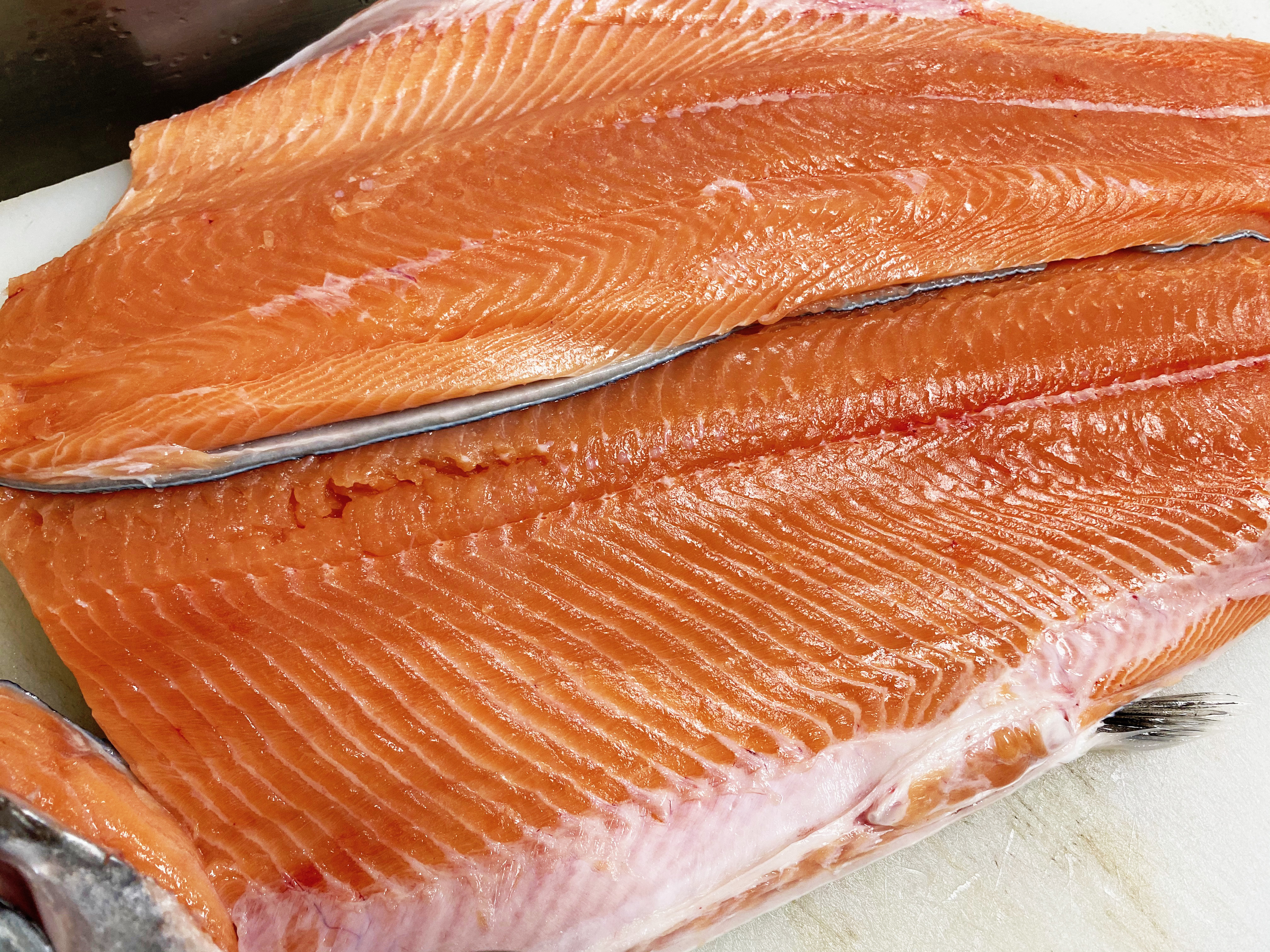 時鮭(トキシラズ)は秋鮭と同じシロザケですが、産卵期ではないため卵や白子がないぶん身に脂がのっているので味わいは最高です。時鮭の中でもランクがあり、弊社の時鮭は(北海道昆布森産)(4kg以上)(※定置網漁)(※活〆)で、非常にランクの高いものを入荷。