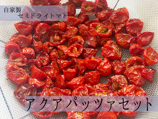 自家製のセミドライトマトは地元のオーガニックトマトを使用。秘伝のレシピでじっくり低温で焼いたのち、天日干しをしています。かなり手間暇のかかる作業ですが、このドライトマトがアクアパッツァの美味しさの立役者です!